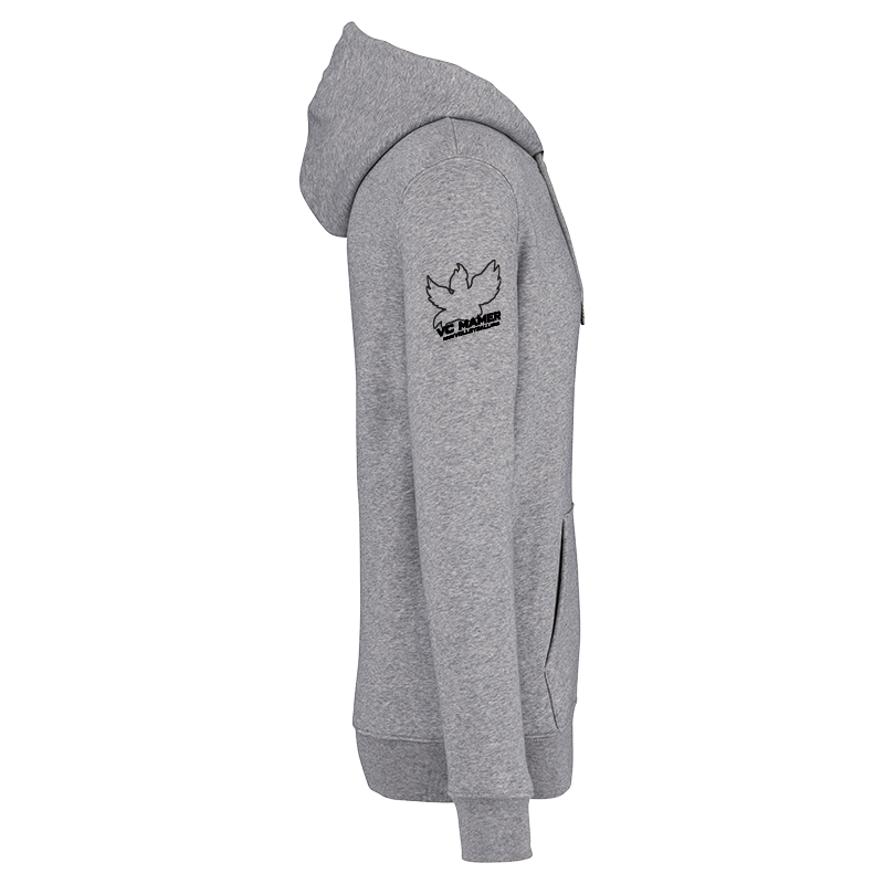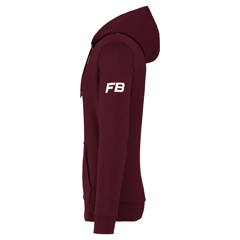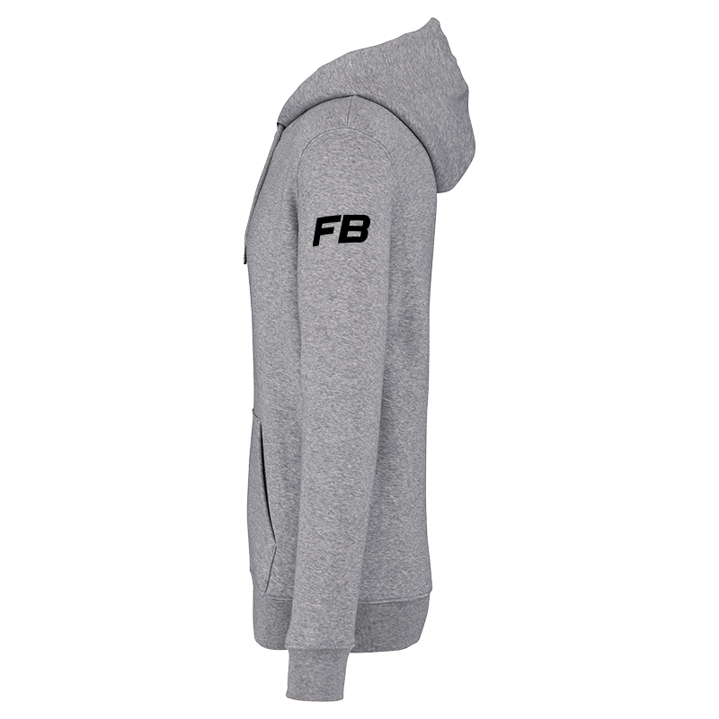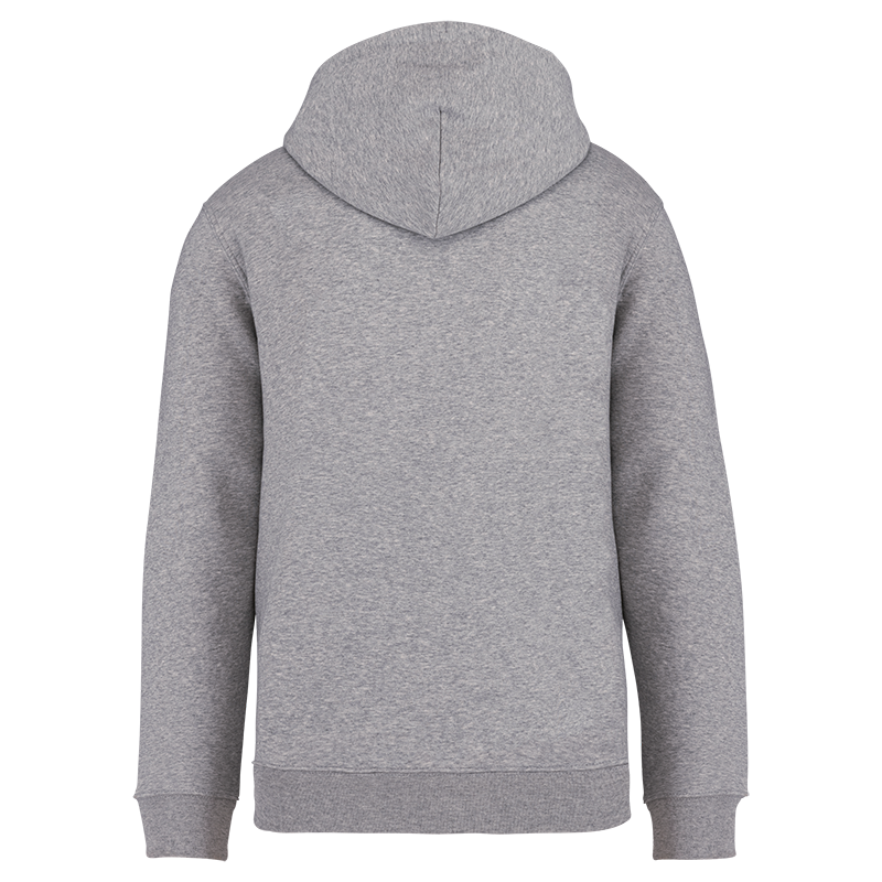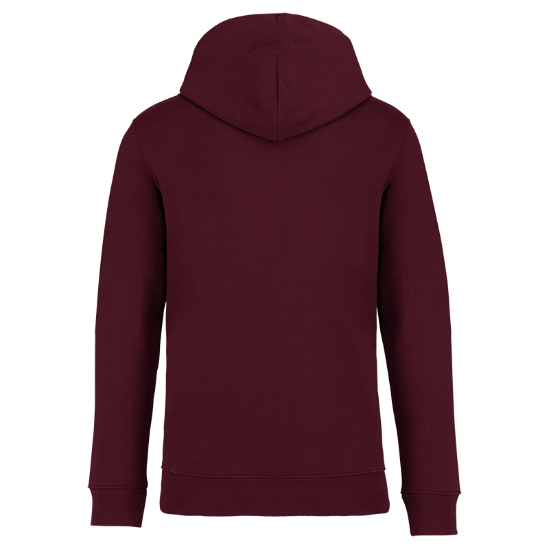 85% organic cotton / 15% post-consumer recycled polyester. Combed ringspun cotton. Fitted cut. Enzyme washed. 3-thread brushed fleece LSF (Low Shrinkage Fleece: pre-shrunk fleece). 1/2 moon on the back. Kangaroo pocket. Ribbed edge 1 x 1 bottom of garment and bottom of sleeves. Double stitching at the bottom of the sleeves, armholes, bottom of the garment and half moon. Interior neckline back neckline. Hood lined in main material with drawstring stop point. Round cord with recycled metal ends and eyelets.