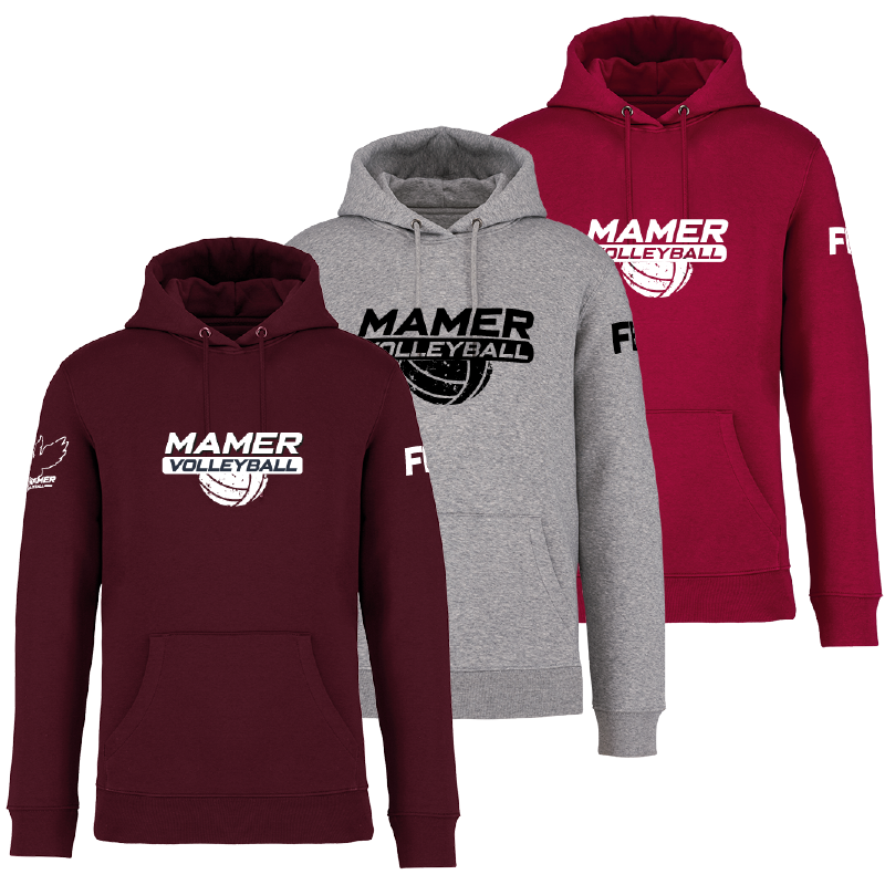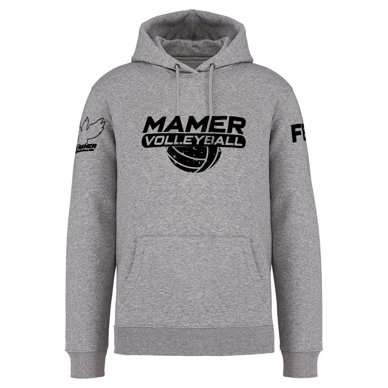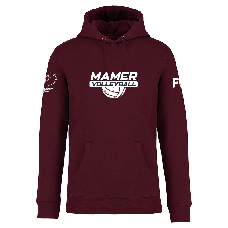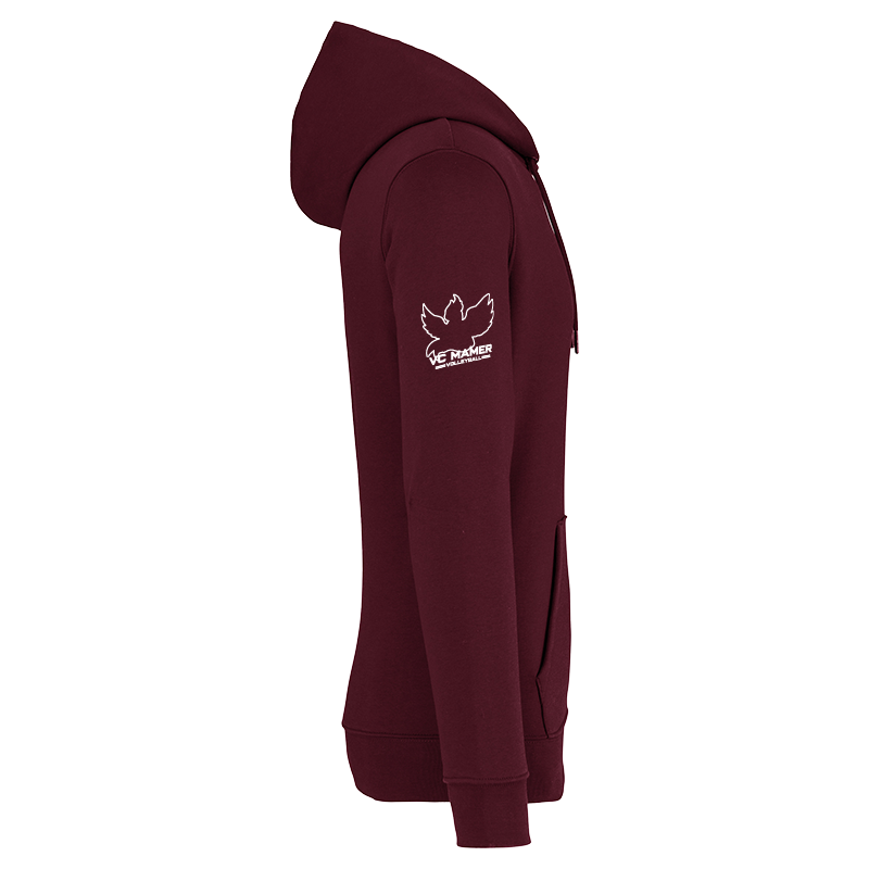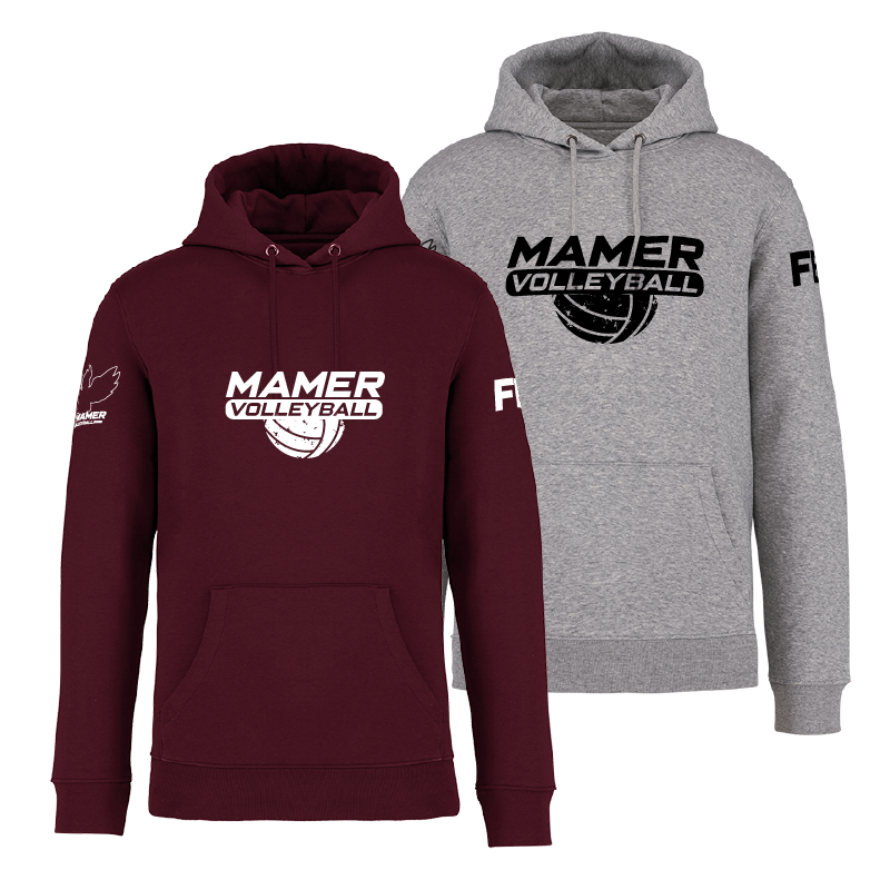 85% organic cotton / 15% post-consumer recycled polyester. Combed ringspun cotton. Fitted cut. Enzyme washed. 3-thread brushed fleece LSF (Low Shrinkage Fleece: pre-shrunk fleece). 1/2 moon on the back. Kangaroo pocket. Ribbed edge 1 x 1 bottom of garment and bottom of sleeves. Double stitching at the bottom of the sleeves, armholes, bottom of the garment and half moon. Interior neckline back neckline. Hood lined in main material with drawstring stop point. Round cord with recycled metal ends and eyelets.